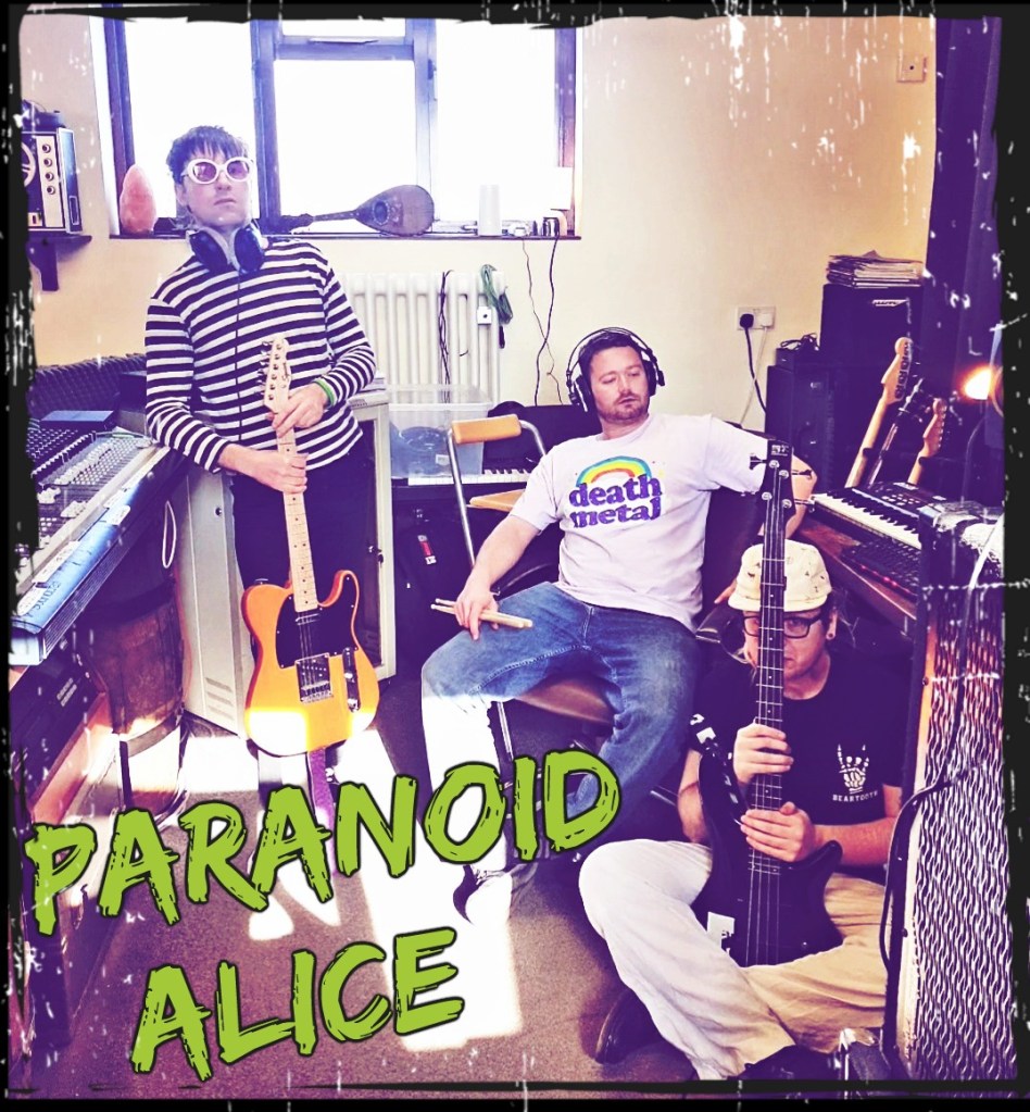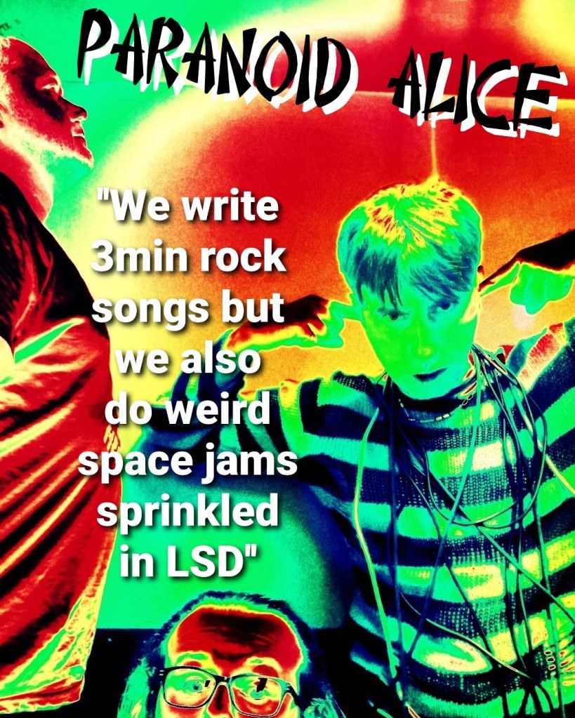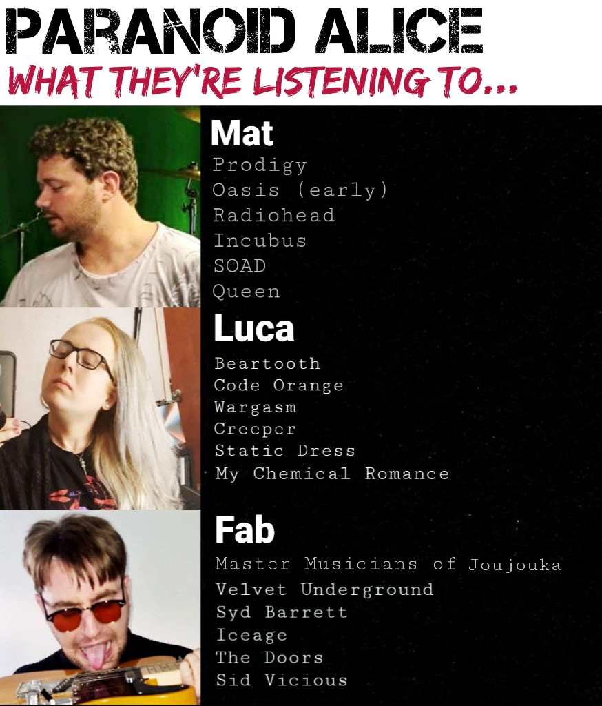 Over the past month Paranoid Alice have been in Electric Fields studio with Chris White recording their debut ‘Mental Illness For The Masses’. After a tense first few days of inner band fights ”stop fucking smiling”, “more reverb!!”, trying to record haunted accordions, ‘5-6-7-8’ count in’s, and more cowbell’s, the album is a mix of dark psych/noise rock/punk and anthemic rock. Spidery psych guitars were whipped & wah-wah’ed, bass FX’s were pushed to 11, while killer drum heads were smashed. The band combines a wild guitar thrashing stage act with dark poetry, chemistry, and sexuality that delves into a twisted Alice In Wonderland cinematic dreamscape.